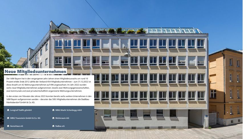 Neue Mitgliedsunternehmen Sechs neue Mitgliedsunternehmen traten 2022 in den VdW Bayern ein - Wir sagen: Herzlich Willkommen!
